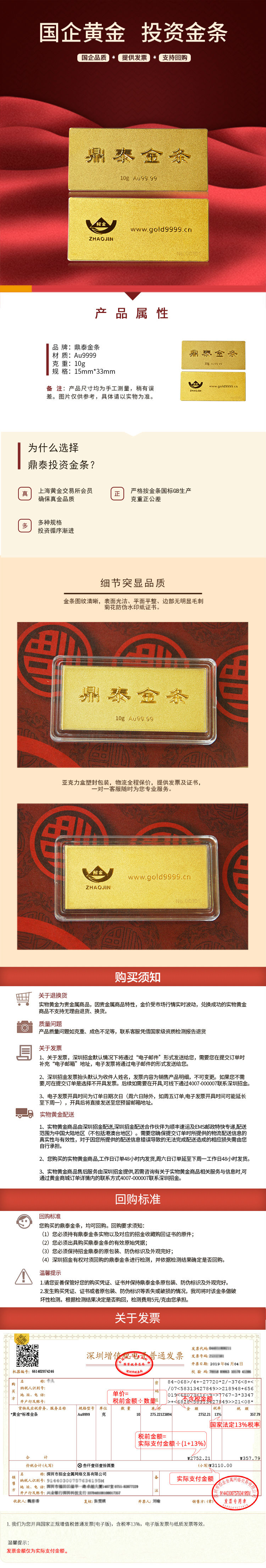 招金 Au9999鼎泰投資金條10克 投資保值收藏
